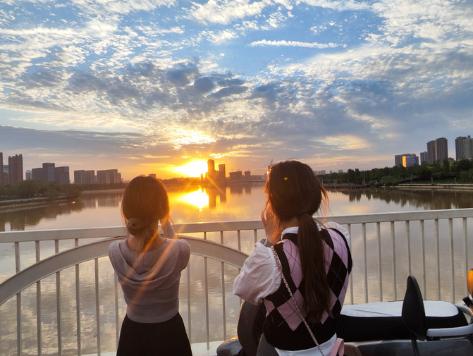 De pie en el puente peatonal de la isla de Tianhua en el río Wuhe, la luz del sol atardecedor brilla en el puente y la superficie del río, y el amarillo dorado y el rojo naranja se entrelazan, reflejándose entre sí. El cielo pasó de azul a amarillo y los colores de las nubes se volvieron brillantes. El reflejo de las nubes se balancea sobre el río y se refleja en el cielo para formar una hermosa imagen.