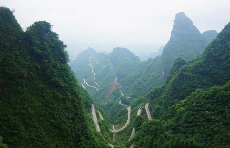 Esta ruta de juego: teleférico subiendo la montaña en el teleférico del lugar escénico durante unos 20 minutos para subir a la cima _ paseo de vidrio (entrada 5 yuanes) _ puente suspendido _ bosque de deseos _ tesoros salvajes _ nubes de sueños imortales _ escaleras mecánicas a través de la montaña - escalones 999 de la cueva Tianmen abajo _ teleférico rápido abajo