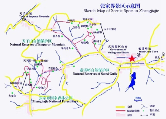 Rutas recomendadas: Parque Forestal Nacional _ Jinfie Creek _ Galería de 10 millas _ Montaña Tianzi _ Yuanjiajie (el primer puente en el mundo, la plataforma de la trampa, el jardín trasero) _ Montaña Tiamen _ Rafting del río Mengdong