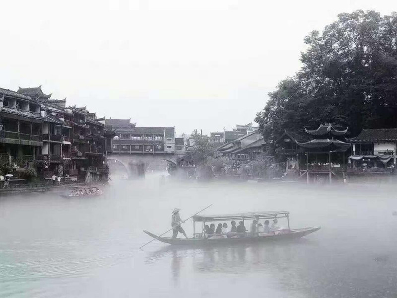 El día en que llegó a Phoenix, llovió. La ciudad antigua está envuelta en el humo y la lluvia, ¡no importa cuán sofisticada la pluma y la tinta no pueden pintar la belleza! De pie en silencio en el río para ver las montañas verdes como Dai, el barco de viaje se balancea suavemente, la torre colgante en el río parece ser inminente, también se ha convertido en una pintura en esta [luvia de humo].