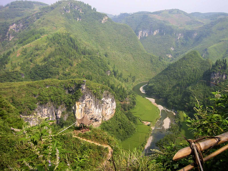 No nos quedamos mucho en el pueblo, caminamos y miramos, no hay rastros de "desarrollo", no nos encontramos con otros turistas. A través del pueblo, a través del campo detrás del pueblo, el campo de pimienta, a través del árbol que dice "Duluo Gran Cañón terreno peligroso, por favor sufre de miedo a las alturas, hipertensión, enfermedades del corazón y el cuerpo débil para detenerse, gracias por la cooperación", Duluo Gran Cañón se muestra frente a nuestros ojos. El Gran Cañón de Duluo, las montañas son maravillosas y hermosas. Cañones, pabellones de césped, campos pastorales, ríos, playas de grava, barcos y montañas exuberantes. Los árboles verdes en el acantilado de la montaña hacen que el acantilado de Junwei sea más curioso. Hay terrazas en la orilla del río en el cañón, como un rollo de pintura pintado con tinta densa. Se dice que los cañones de Duluozhai a menudo aparecen mares de nubes, y los picos de las montañas en el mar de nubes esparcidos. Debido al clima, no hemos visto este mar de nubes.