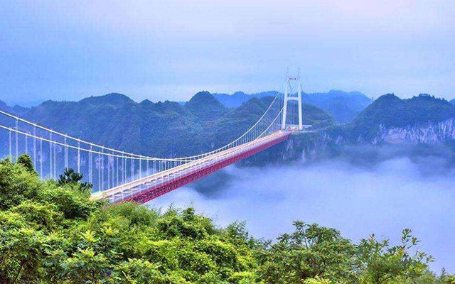 El puente colgante a través del cañón es el primero en el mundo, con un tramo principal de 1176 metros, que es el puente colgante de viga de acero más grande del mundo a través del cañón. El ancho de la cubierta es de 24,5 metros y tiene cuatro carriles en ambas direcciones. La cubierta del puente es de 355 metros de altura desde el fondo del cañón, lo que equivale a más de 110 pisos de altura. Desde la cima de la montaña, entre las nubes y la niebla, es simplemente insondable.