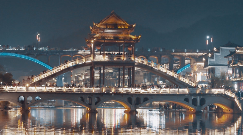 Originalmente conocido como Wohong Bridge, también conocido como "Torre de Viento y Lluvia", fue construido en los primeros años de Hongwu de la dinastía Ming y se encuentra en el centro de Phoenix. Mirando toda la ciudad de Phoenix en el puente Hong, el paisaje pintoresco a ambos lados del río Tuojiang es una vista panorámica. Hongqiao se divide en dos pisos superiores e inferiores, el primer piso es principalmente tiendas y tiendas de comestibles, y el segundo piso es el edificio de cultura popular, que contiene todas las obras de pintura y caligrafía sobre el edificio de viento y lluvia de Hongqiao desde la antigüedad hasta el presente, que también es un buen lugar para visitar y beber té.
