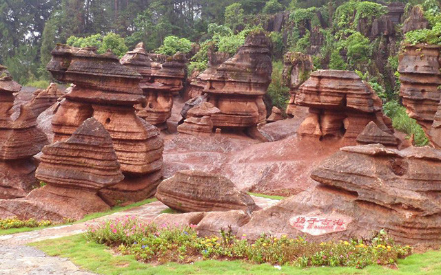 Entrar en el bosque de rocas rojas es como entrar en un bar de oxígeno natural, el canto de los pájaros y el aroma de las flores, tranquilo y pacífico, es un lugar natural de preservación de salud. Algunos como espíritus explorando el mar, algunos como águilas golpeando el cielo, algunos como flores de bainia en plena florecimiento, algunos como torres de picos de castillo, algunos como loto sentado de Guanyin, algunos como acantilados de madre, algunos como un crucero de portaaviones, algunos como soldados de piedra, miles de posturas, coloridos.