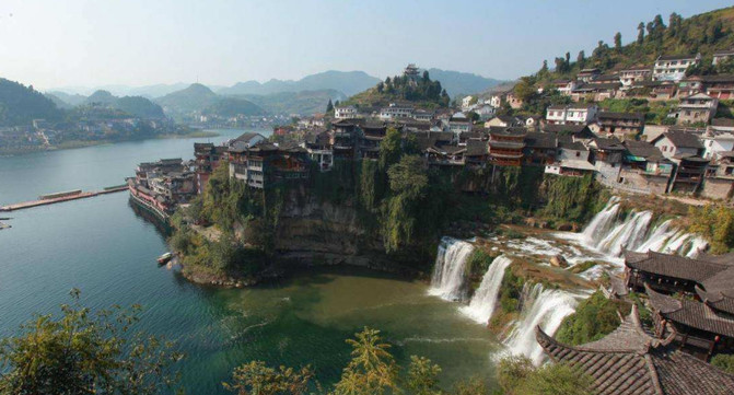 Esparcidos con pisos colgantes, luces tranquilas de ensueño, cascadas que caen, junto con las montañas verdes escondidas en la noche, es como un sueño superficial.