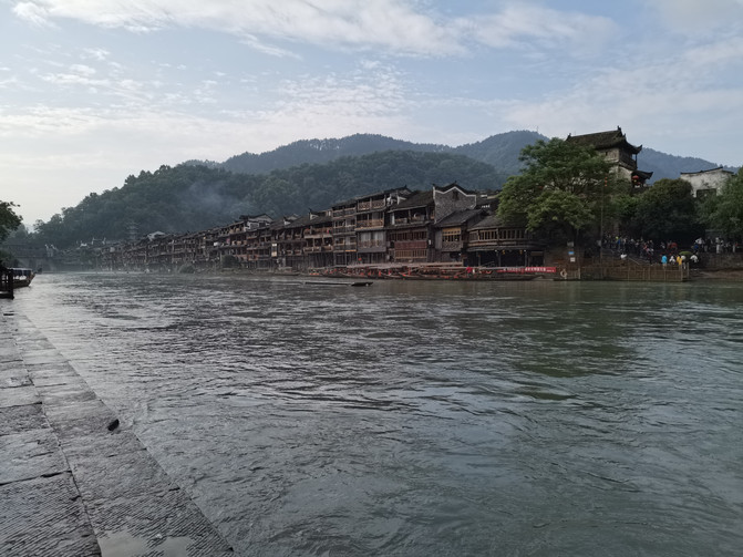 Las nubes se disiparon, el amanecer, el Phoenix se aclaró, los turistas saltaron rocas en el río, desde la dinastía Tang, es la única manera de entrar en Qianzhou en el entonces Wuzhai Sicheng (Fenix). Qing Kangxi cuarenta y tres años (1704) reconstruido, todavía es el antiguo camino de Qiancheng a Phoenix. También llegamos a la antigua ciudad desde aquí.