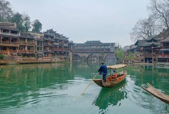 Ha sido más de las cuatro de la tarde en Phoenix, sin la primera vista impresionante, ligera apariencia natural. El río Tuojiang, el barco Wupeng y la torre colgante tienen un fuerte estilo Miao en el oeste de Hunan.