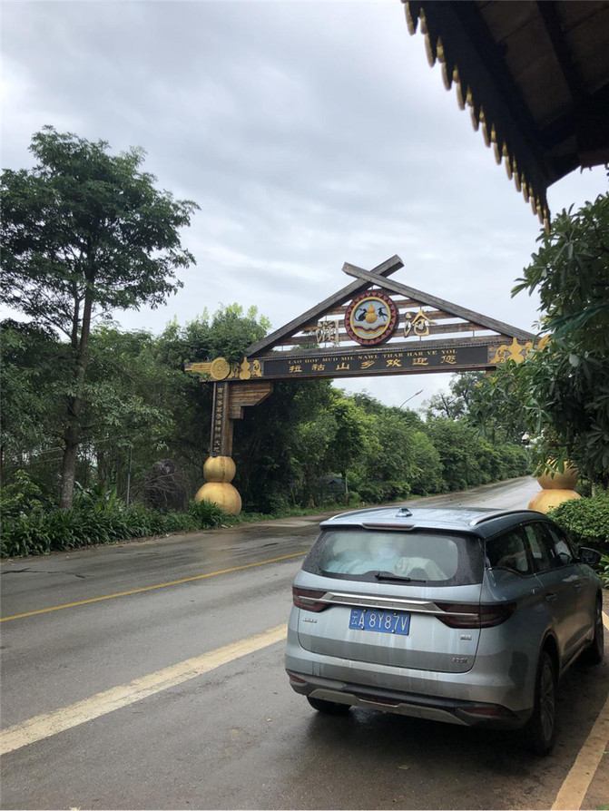 A continuación, fuimos al lugar escénico de Yizhai y dos países, que está al lado del famoso pilar fronterizo No.71 en la frontera entre China y Myanmar. La frontera divide un pueblo Dai en dos, formando un fenómeno único. Debido a que este es un lugar escénico, el tráfico de personas es muy grande, simplemente navegamos por él. En este momento, Wang llegó a llamar, dijo que la comida Dai ya estaba lista, solo esperamos a que comiéramos la comida, así que nos apresuramos a partir. Alrededor de 10 minutos, Wang nos recogió en la entrada de la aldea y nos saludó con entusiasmo.