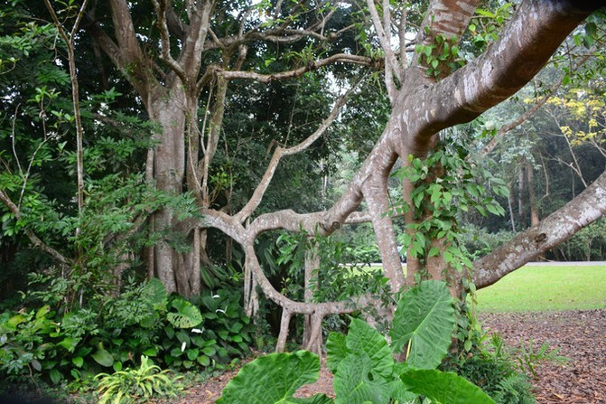 Tres árboles gigantes forman una maravilla de la selva tropical: el "fenómeno de la reincorporación vegetal". Mirando el árbol por delante, cuando creció gradualmente, dejó el caballo de la infancia que creció con ella y se lanzó a los brazos del árbol más alto al lado. La naturaleza interpretó de manera tan realista las diversas visiones de la sociedad humana, lo que fue impresionante. Estos tres árboles son árboles de banyan, la corona alta, pero el sistema de raíces es muy poco profundo, para apoyar el gran cuerpo del árbol, desde el tallo o rama crece raíces adventicias o raíces aéreas, la punta de la raíz aéreas se extiende en el suelo, la parte subterránea crece rápidamente en el sistema de raíces, la parte sobre el suelo crece en el tronco, cuando hay otros árboles al lado como punto de apoyo, también no duda en volver a casarse, y junto al árbol fusionado en una familia, este es el fenómeno extraño de volver a casarse.