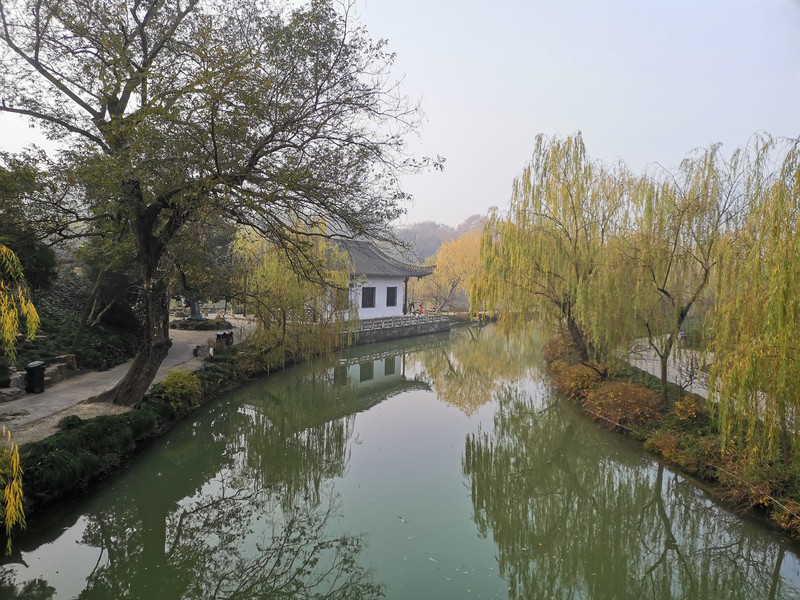 El largo dike. Un dique de sauce frente a la puerta sur es plano y delgado, y los sauces de melocotón son escasos y el paisaje es hermoso. Desafortunadamente, no es primavera y verano, las ramas de sauce son un poco menos encantadoras y las flores de melocotón aún no han florecido.