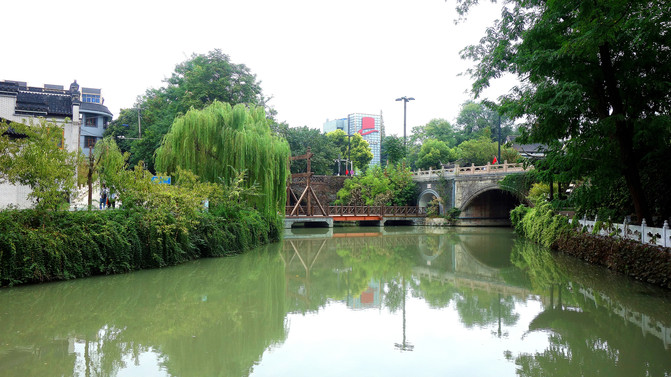 El agua llega aquí para formar una amplia superficie de agua, que es la confluencia del foso y el río de Xiaoqiang en la ciudad. A la izquierda continúa a lo largo de la fosa, el agujero del puente de perforación al sur es el río Xiaoqiang.