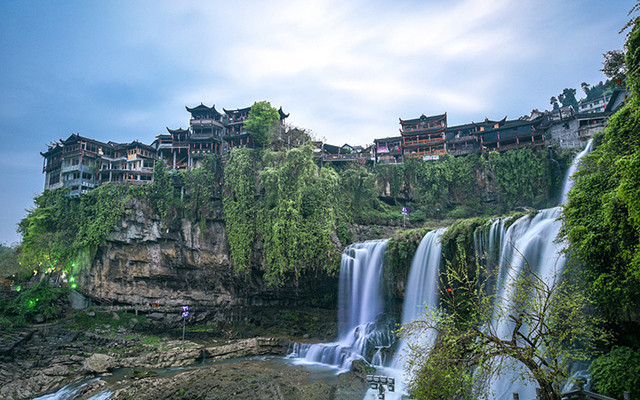 La ciudad de芙蓉 no solo está colgada sobre la cascada, sino que también está de pie sobre las montañas. Las montañas verdes y las aguas verdes se ven a su alrededor flotando en el techo verde, como el reino de las hadas. La torre colgante donde viven los aldeanos está arraigada en las profundidades de la tierra, como un gigante que se erige entre las montañas.