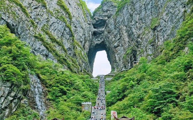 Tianmen Mountain Forest Park tiene la altitud más alta del mundo natural a través de la cueva de montaña y la cueva de Tianmen, Tianmen Cave debajo de un conocido "999 escalones" y acantilado de la pasarela de vidrio, "Viaje romántico de la esposa 3" perforación de esta pasarela de vidrio, en el acantilado, como caminar en el cielo en el valle profundo, miedo, emoción!