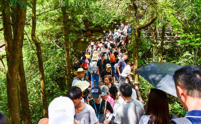 Esta es la escena después de salir de la escalera del Bailong, todavía es la gente alineada, magnífica, extremadamente espectacular, lo que debe explicarse es que el día es soleado, la temperatura bajo el sol caliente supera los 35 grados, pero todos todavía lo disfrutan.
