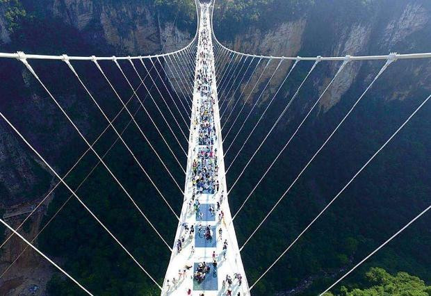 El puente de vidrio del Gran Cañón de Zhangjiajie tiene una longitud total de 430 metros, una cubierta de 6 metros de ancho y una cubierta de 300 metros desde el fondo del valle. En la actualidad, es el puente de vidrio transparente más largo y más alto del mundo y el primer puente colgante de vidrio de cables espaciales variables del mundo, y tiene el primer lugar en el mundo en diez categorías. Tiene una variedad de funciones, como salto de bungee, slide y espectáculo de escenario. Los expertos en puentes nacionales y extranjeros comentaron que "el puente de vidrio del Gran Cañón de Zhangjiajie es un milagro en la historia de la arquitectura de puentes del mundo".
