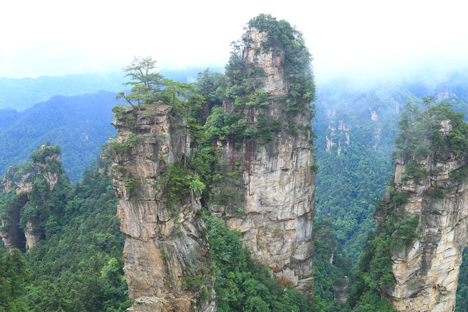 Primer día, al punto escénico central de Wulingyuan _ [Zhengjiajie](Lugar de filmación de la película Avatar, excursión: camina en el paseo marítimo de 600 metros de altura vertical del acantilado para ver el primer puente del mundo (puente formado naturalmente entre dos paredes de piedra, 10 metros de largo, 4 metros de ancho, muelle de unos 600 metros de altura), San Guan Tai (Vista el acantilado de Baizhang, vista panorámica de Sha Dao Gully a los pies, vista la matriz de chismes de la naturaleza), el hombre simio mira la luna, las cinco mujeres venen el cumpleaños (también conocido como el billete de 100 yuanes entre 90 yuanes), el pabellón de la amistad sino-coreana, la plataforma de confusión (Vista el paisaje de Caster: el bosque de cuarzo de piedra arenisca), la columna Qiankun (Montaña Halleluya). Después del almuerzo, visitará "Bonsai expandido, País de las Maravillas reducido" el título del rey de los bosques de picos -