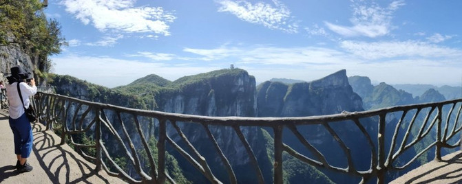 Pasarela de vidrio: Pasarela de vidrio es un pasillo de vidrio suspendido que se completó en septiembre de 2011. Situado a 500 metros del comienzo del paseo marítimo del valle fantasma de la montaña Tianmen, aquí es una bifurcación. Para aquellos que les gusta el punto de estimulación, puede elegir caminar de esta manera, o puede dar la vuelta al camino de piedra al lado. Está hecho de vidrio templado duro, rodeado de barandillas metálicas, con vidrio transparente debajo de sus pies, 60 metros de largo, 1.430 metros sobre el nivel del mar en su punto más alto y 1,6 metros de ancho. Caminar por encima, puede fortalecer la bilis. Los cobardes no lo hagan.