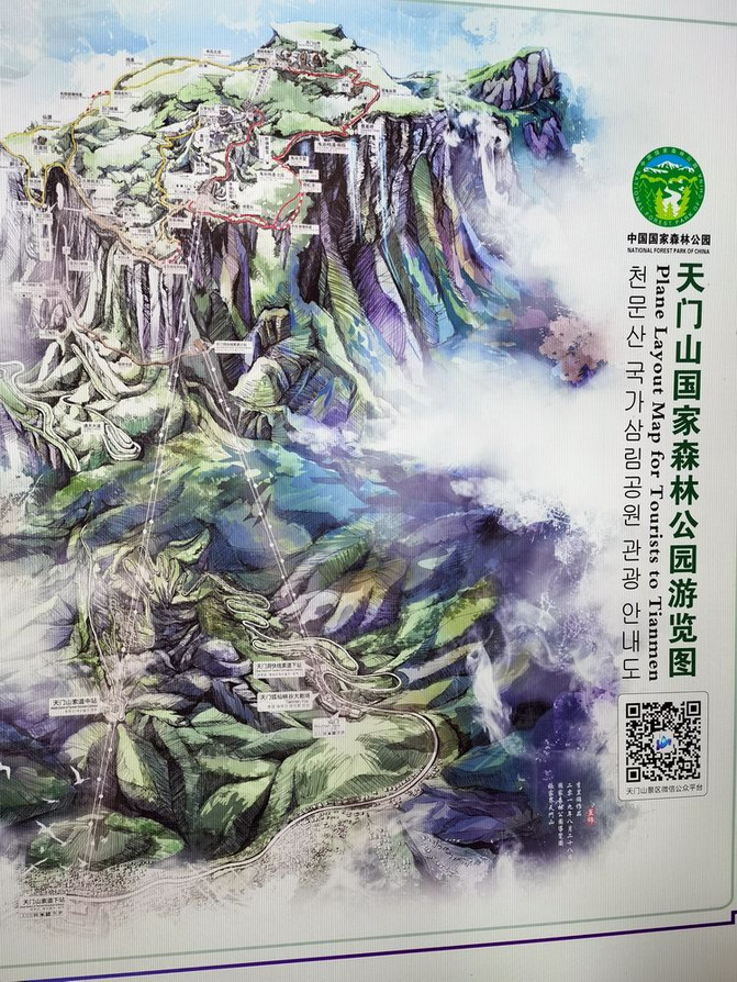 Debajo del teleférico también se puede ver la famosa maravilla de la carretera número uno en el mundo: la carretera de la montaña Tiamen. La carretera de Panshan tiene una longitud total de aproximadamente 11 kilómetros, con una elevación bruscamente elevada de 200 metros a 1300 metros. Los acantilados a ambos lados de la avenida son miles de barrancos, y el valle vacío es profundo. Hay un total de 99 curvas. 180 grados de curvas agudas se extienden una a otra. Rodeado por un cinturón de jade, serpenteante y estrechamente conectado, y se superpone en capas.