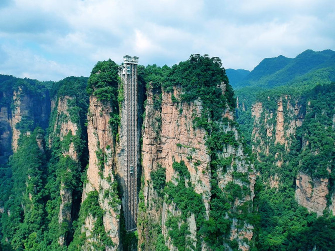 "Zhuang" es un paisaje artificial Bailong escalera incrustada en la montaña con una fuerza asombrosa, como un dragón gigante que lleva a los pasajeros en el cielo, verticalmente hacia arriba y hacia abajo.