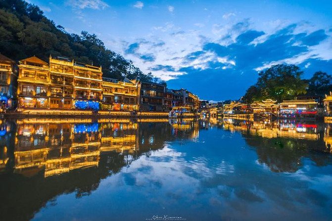 Después de conducir en la carretera durante diez horas, finalmente llegó a la ciudad antigua de Phoenix alrededor de las nueve de la noche, la ciudad antigua en la luz de la noche es particularmente encantadora, la noche está desorientada, mi corazón está borracho, las luces delinean una gran cantidad de noche, reflejado en el agua corriente murmurando, más un poco encantador.