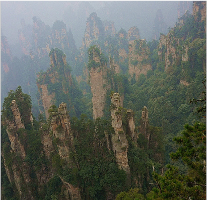 La montaña Tianzi, uno de los cuatro lugares escénicos de Wulingyuan. Se extiende alrededor de casi 40 kilómetros, con un área total de casi 100 kilómetros cuadrados. Su punto más alto es el pico Tianzi, con una altitud de 1262,5 metros sobre el nivel del mar y una altitud mínima de 534 metros sobre el nivel del mar.